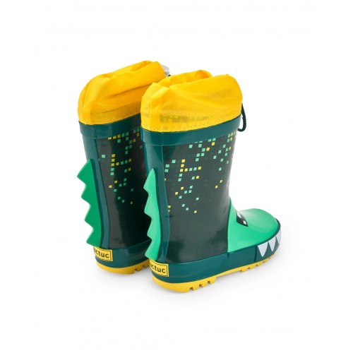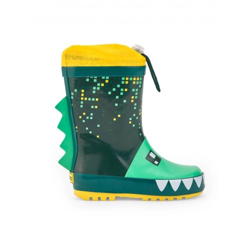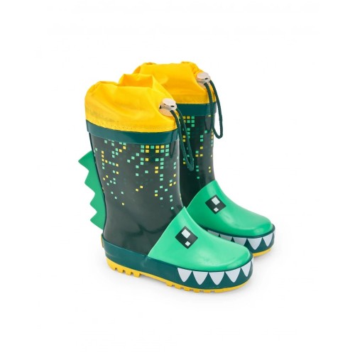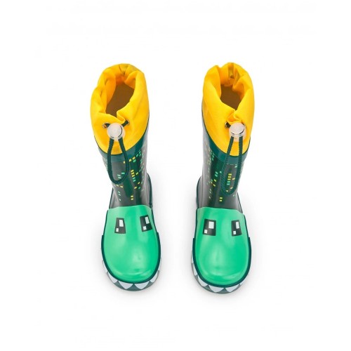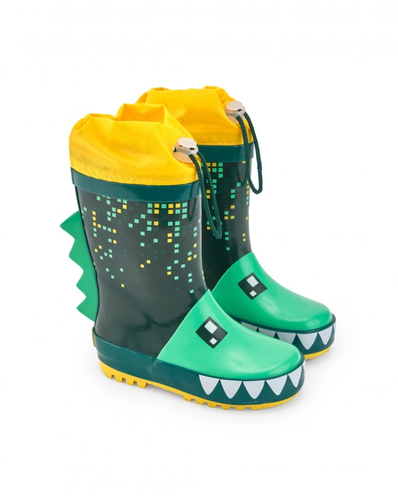 Green rain boots for kids with dinosaur design from the Cyber Dino collection