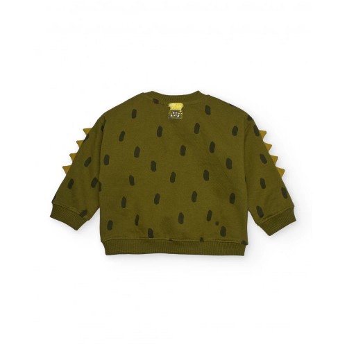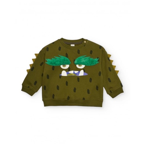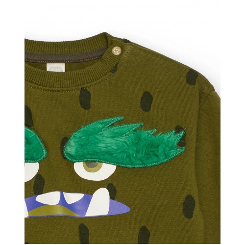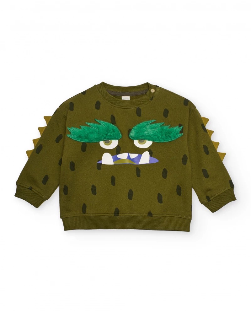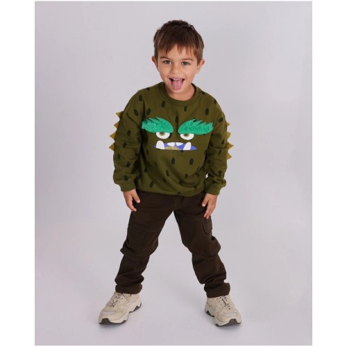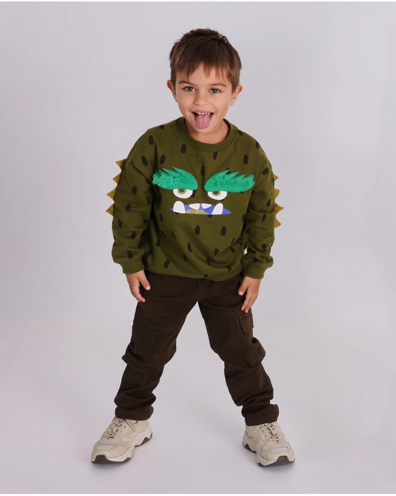 Green boys' sweatshirt with a fun monster print on the front, embossed details like
