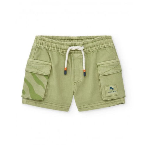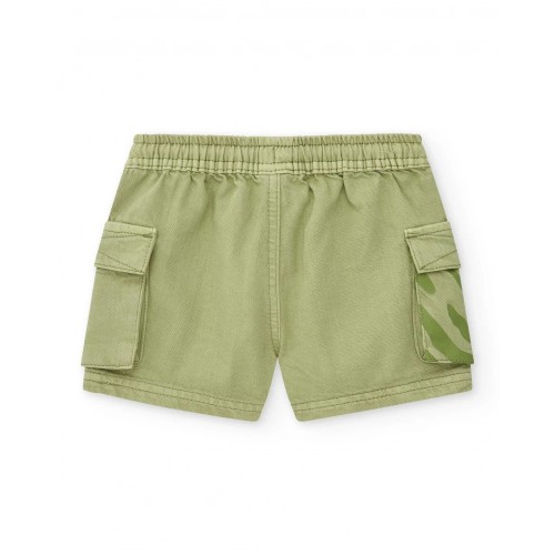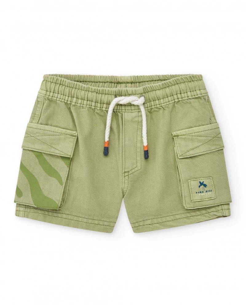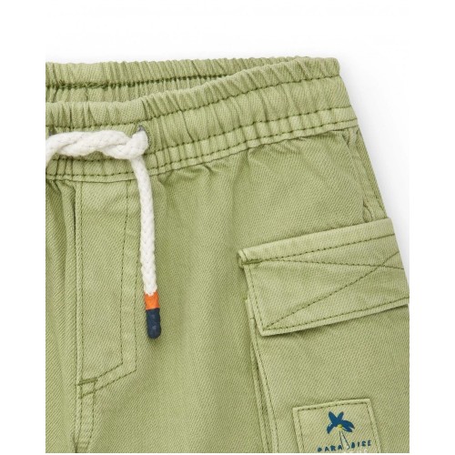 Boys' green twill bermuda with cargo pockets and adjustable elastic waistband with decorative drawstring.