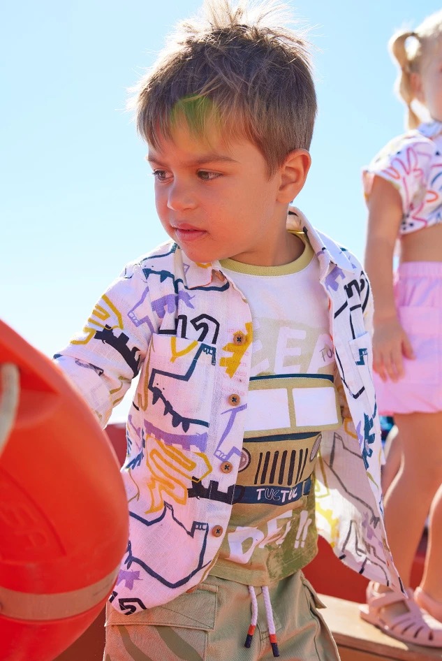 White T-shirt for boys with multi-colored vehicles and shoulder closure