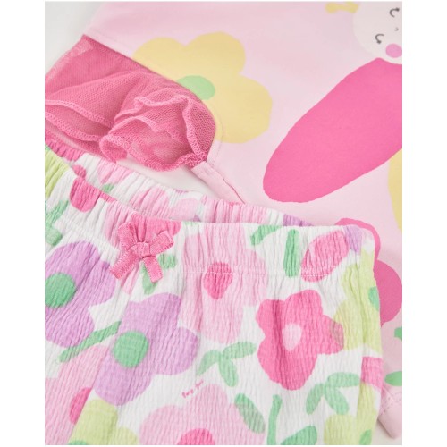 a cheerful floral print in soft tones and ruffled hems that add a sweet, fresh touch. The
