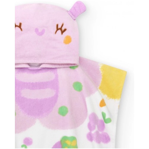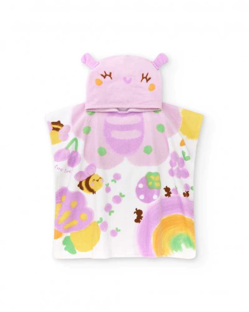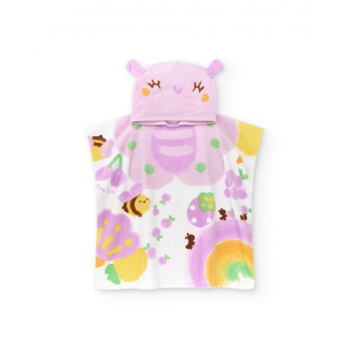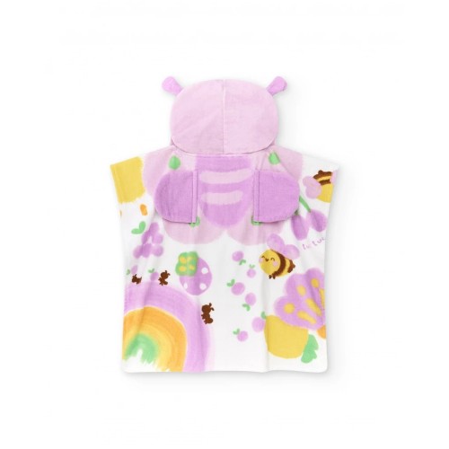 Girls' poncho towel decorated with a lilac floral print. It features a butterfly-designed