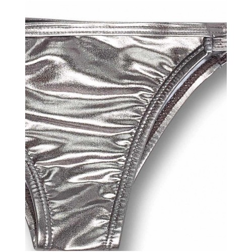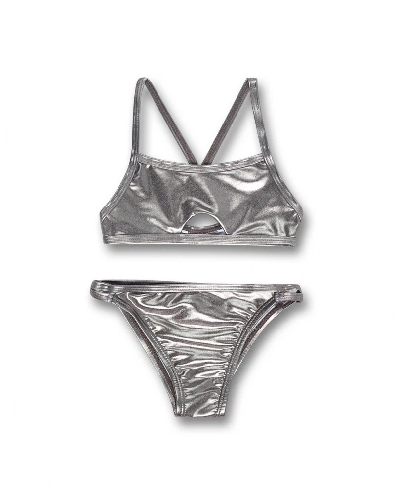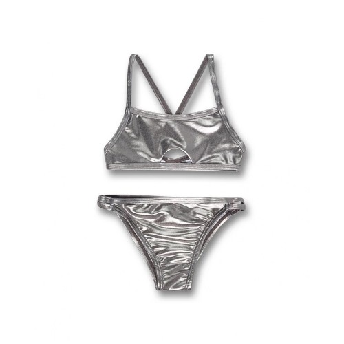 Metallic silver bikini for girl. Top with crossed straps on the back