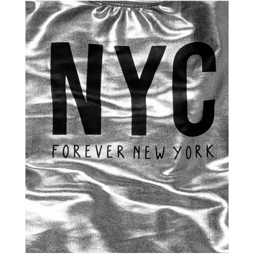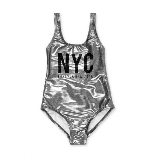 Metallic silver swimsuit with 'NYC Forever New York' sign in black for girls