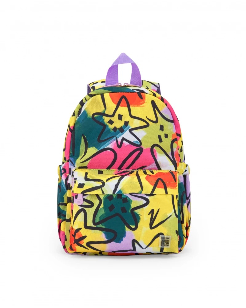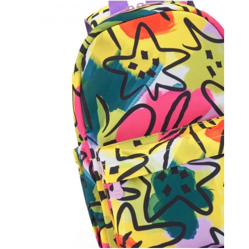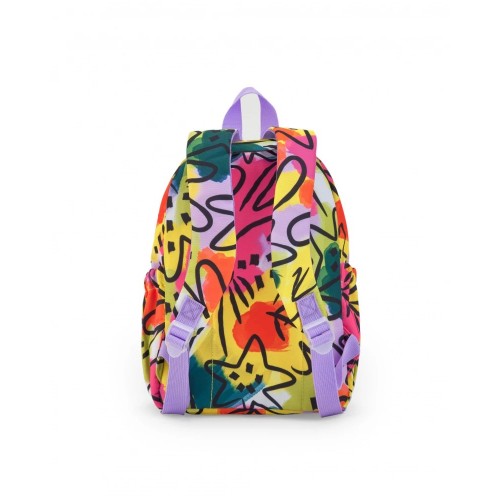 Girls' backpack with a multi-color design and adjustable lilac straps for added comfort.