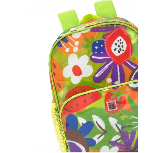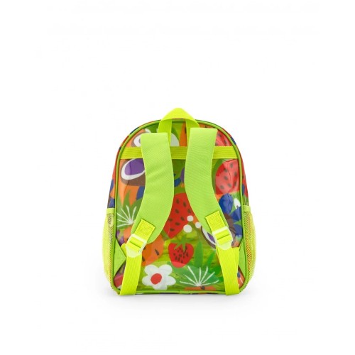 Girls' backpack with a multicolored design and a tropical print featuring fruits