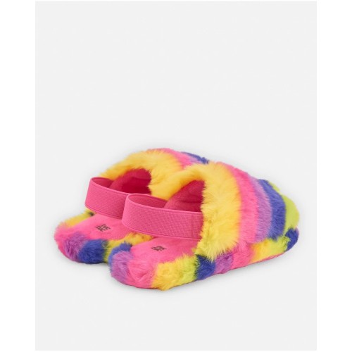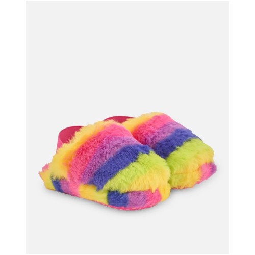 Girls' slippers with a vibrant, multi-colored design, made of soft fur for warmth and comfort.
