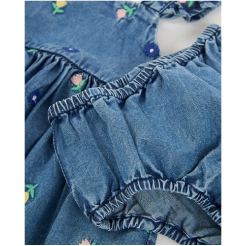 finished with a ruffle, and the matching bloomers is made of plain denim fabric, with