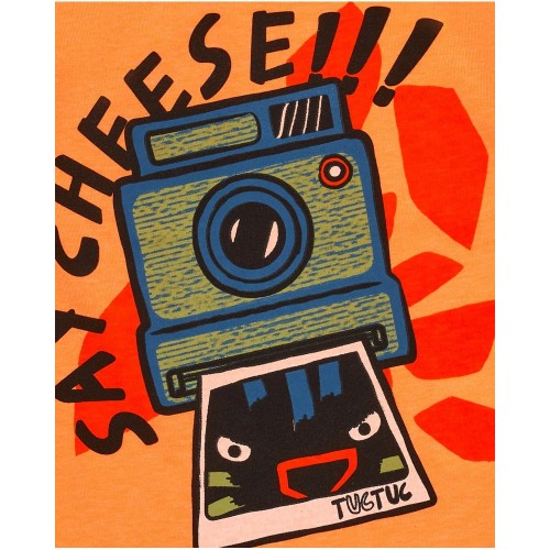Boys' orange knit T-shirt with an instant camera print and decorative text.