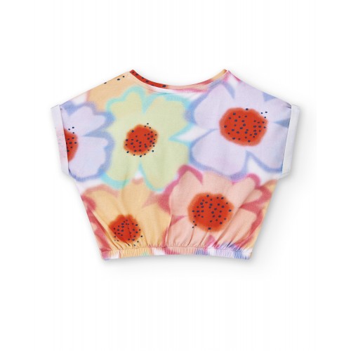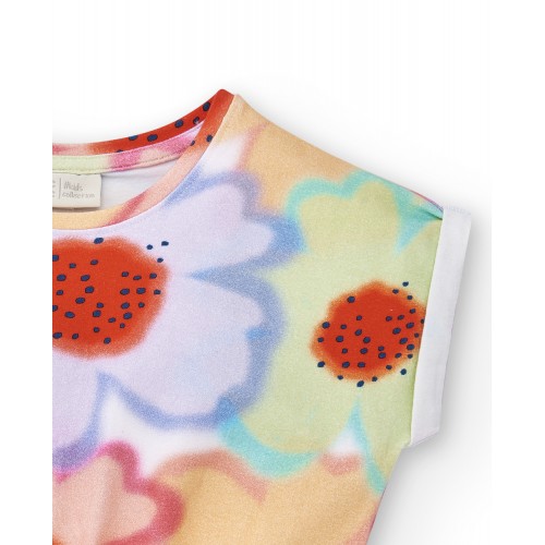 Two-piece knitted set for girls. Lilac top type t-shirt with orange flower print. White shorts with ..