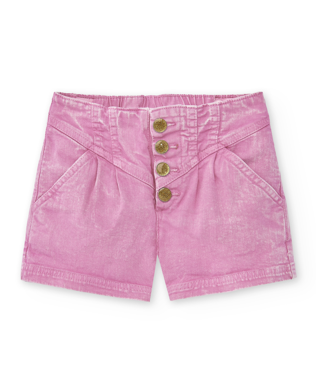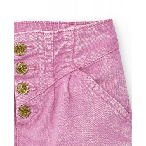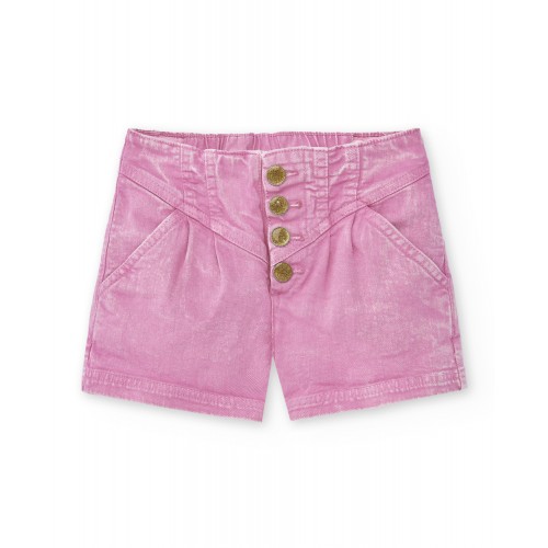 Lilac denim shorts with pockets and front closure with shiny buttons for girls.