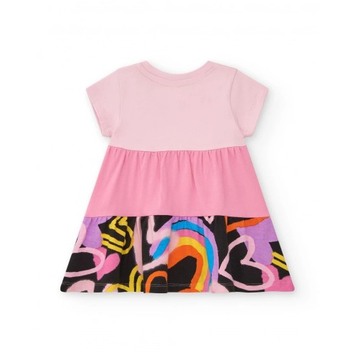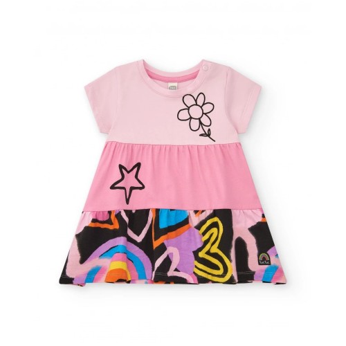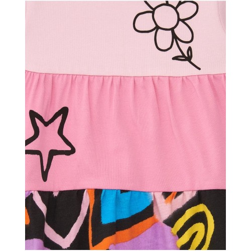 Pink dress for girls with multicolored stars and flowers
