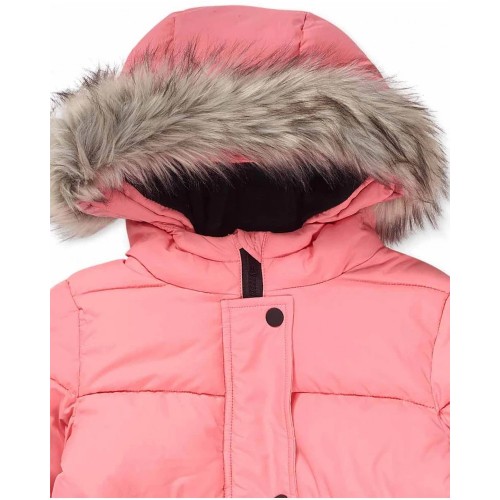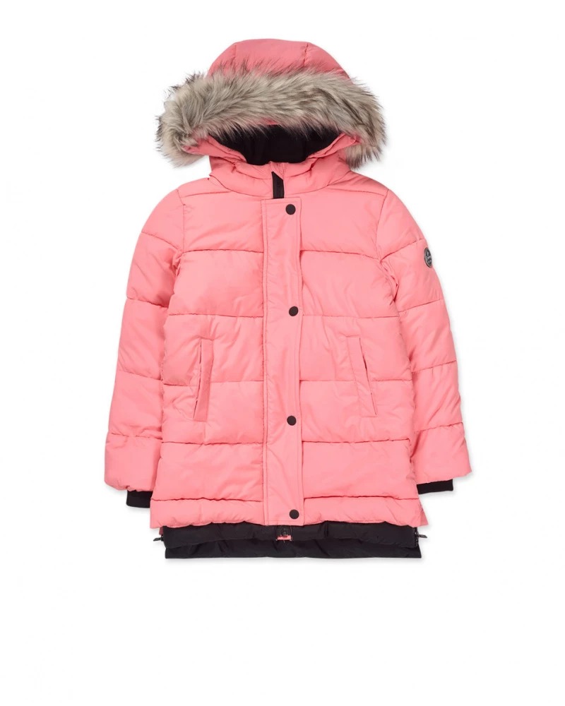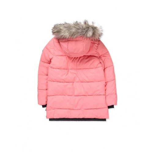 Details: Pink flat parka with front pockets, front zip closure and hood with fur for girl.