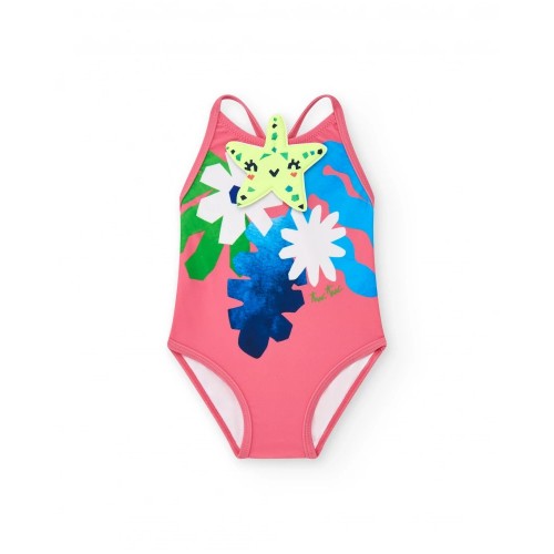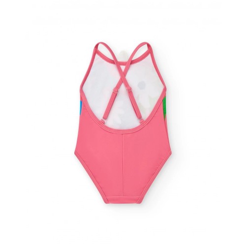 Pink girls' swimsuit with a colorful floral print in shades of green, blue,