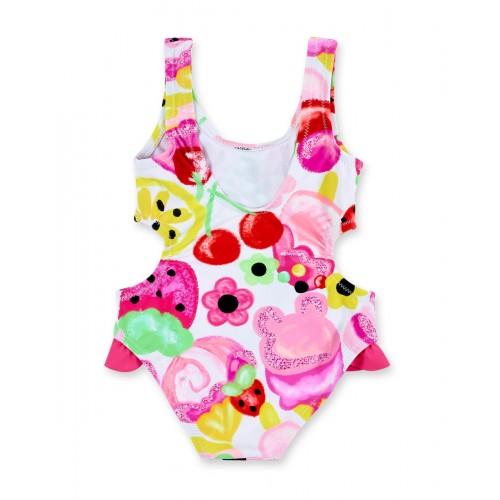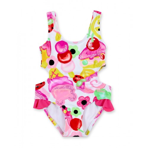 Pink trikini with ice cream print and side ruffles for girls.