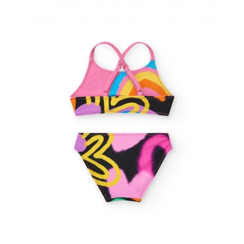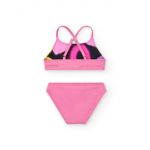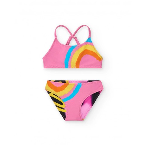 Girls' pink bikini with a bright rainbow print. The top features crisscross back straps