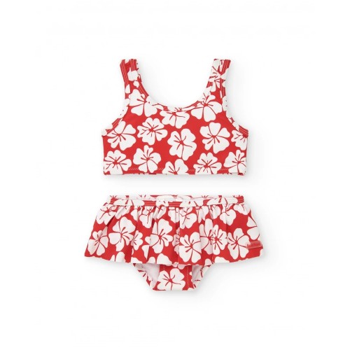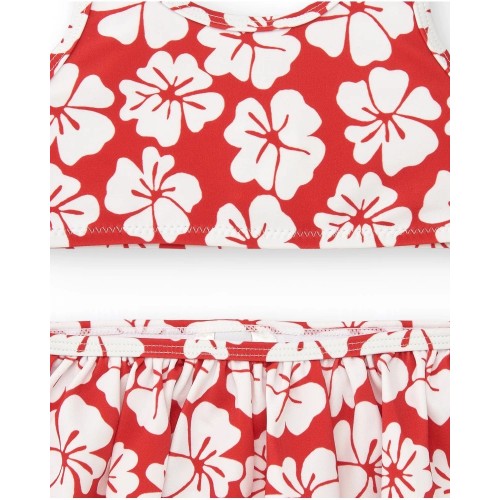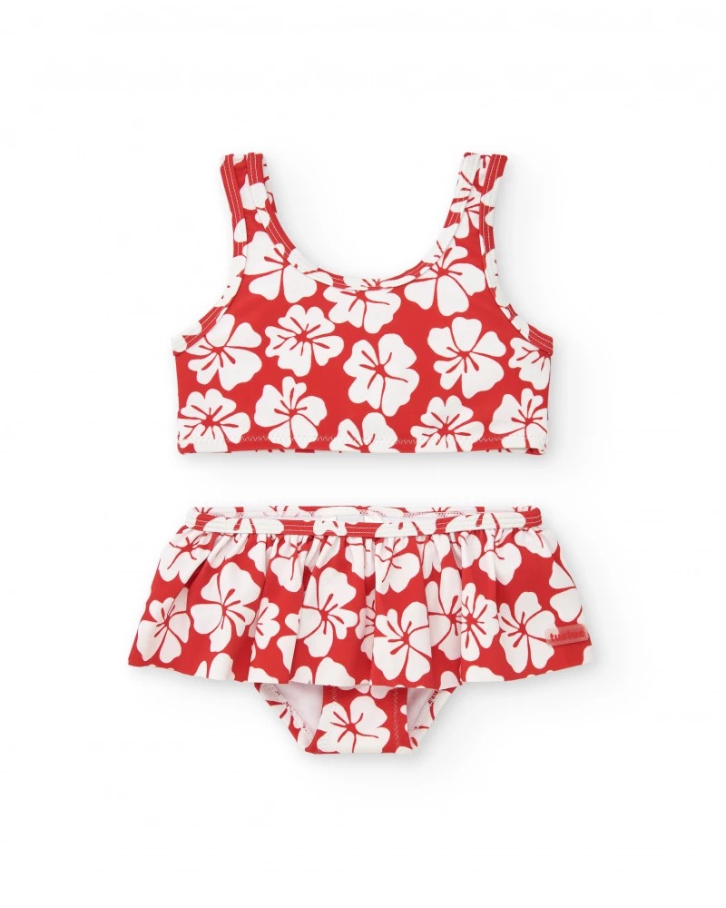 Red girls' bikini with a white floral print. The top features a sporty design,