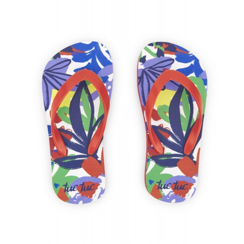 White T-shirt with colorful floral print and gathered waist. Navy blue shorts with elastic waist and..