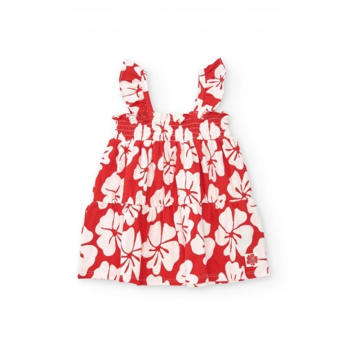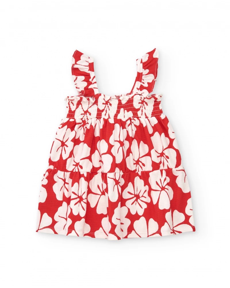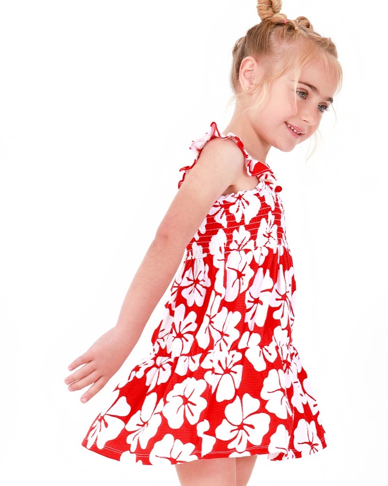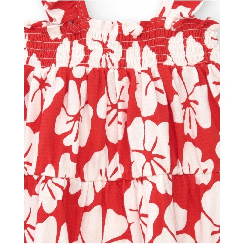 Girls' red knit dress with a white floral print. Features straps with gathered details.