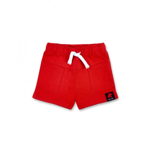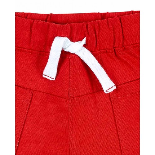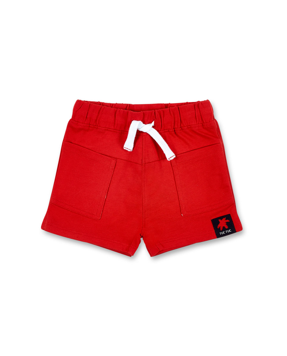Red knit shorts with pockets, elastic waistband and drawstring for boys.