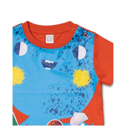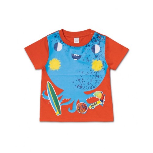 Red knit T-shirt with blue octopus print and ball appliqué for boy.