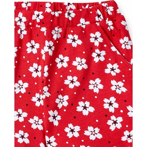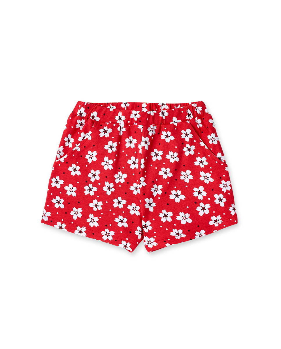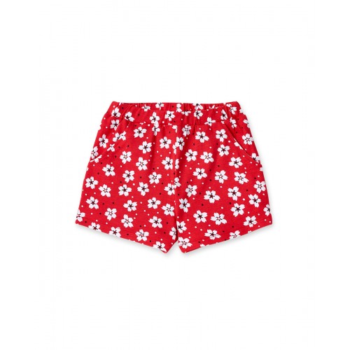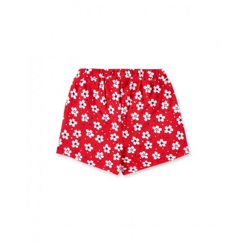 Red knitted shorts with a white flower print and elastic waistband for girls.