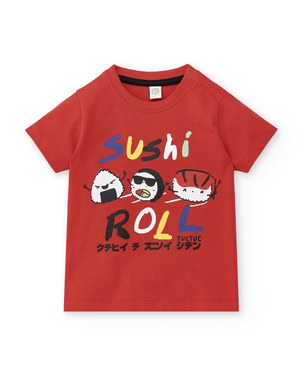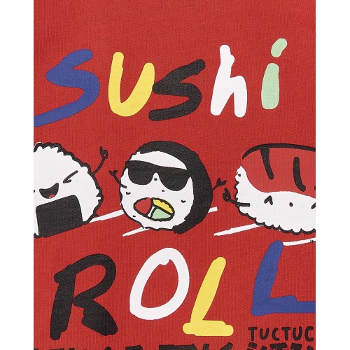 Red knit t-shirt with sushi print and colorful 'Sushi Roll' sign for boys.