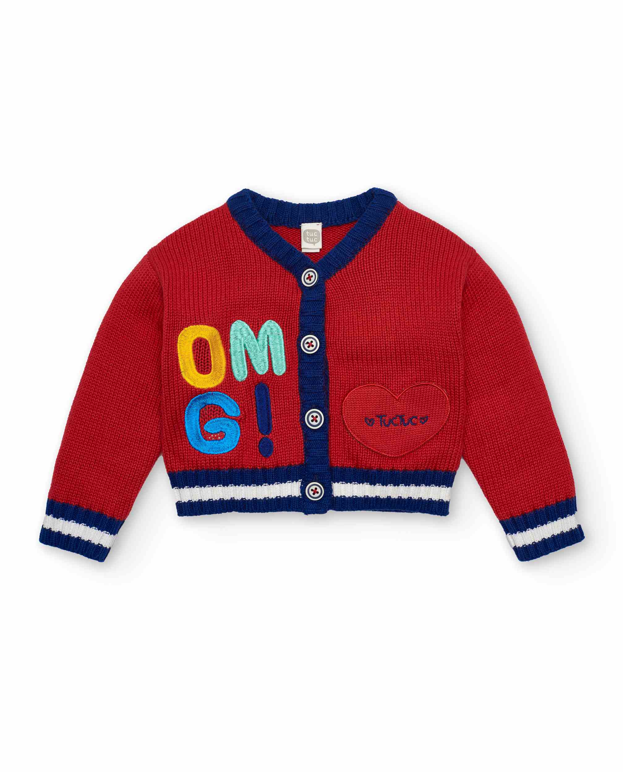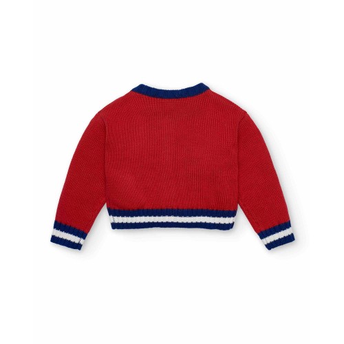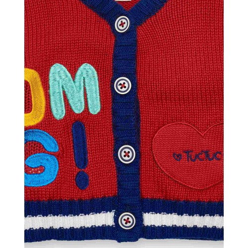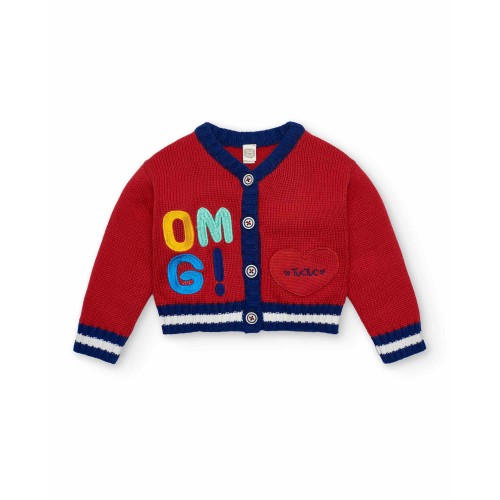 Red knitted jacket for girls, with fun embroidered details on the front, including letters in