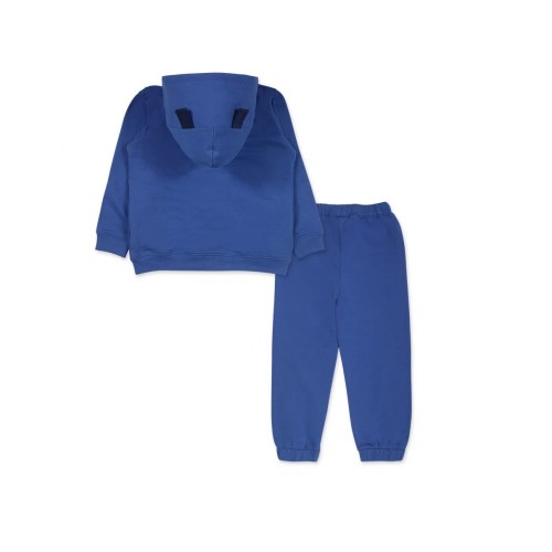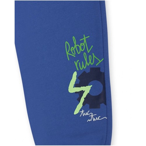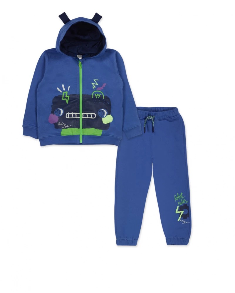 Two-piece plush set for a boy. Blue jacket with robot print, front zip closure and hood.