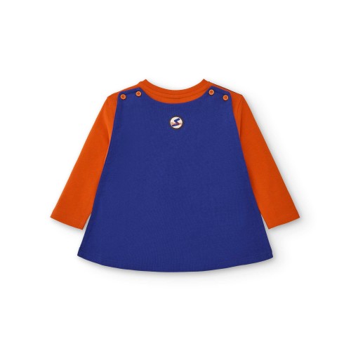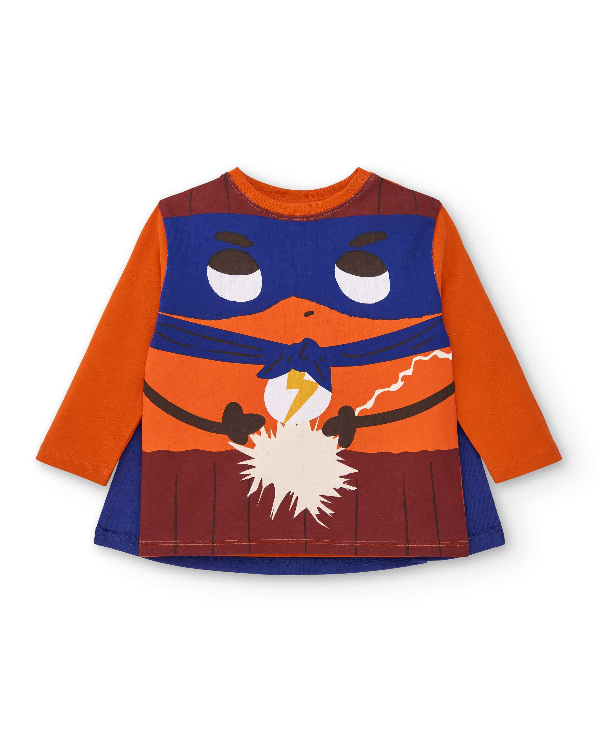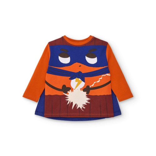 Long-sleeved T-shirt for boys in vibrant orange, with a fun superhero print on the