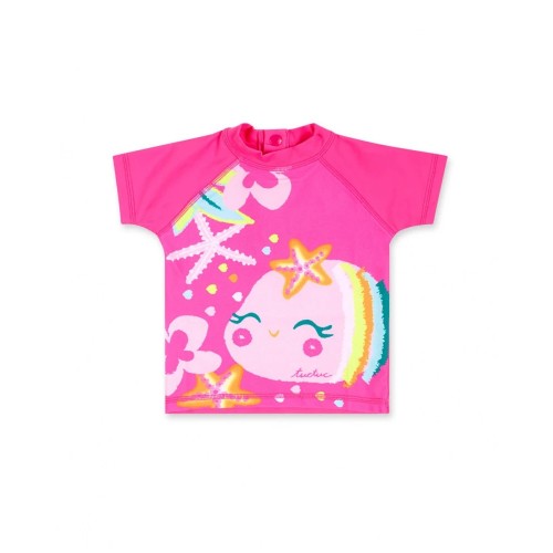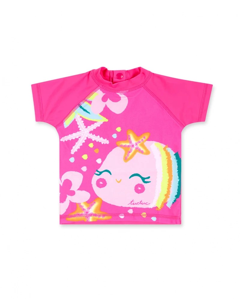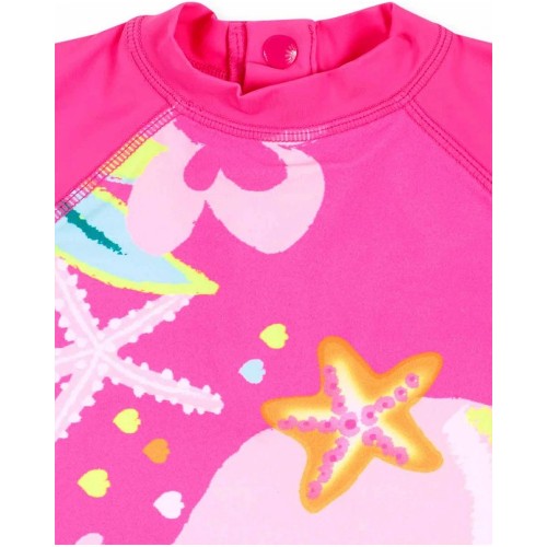 Fuchsia swim shirt with navy print for girl. Seashell Collection