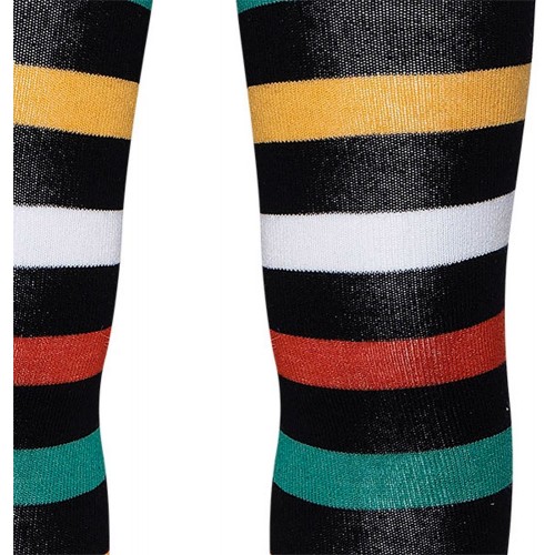 Leotard with horizontal coloured strips.