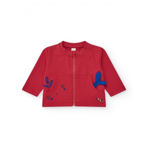 Boys' three-piece plush tracksuit: a red jacket with zip closure and decorative pockets with marine details,