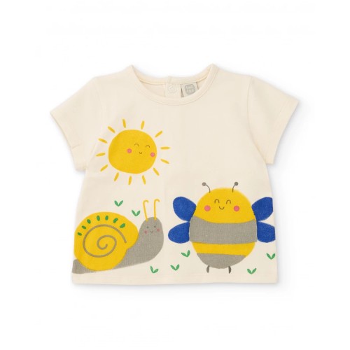 The T-shirt, in a light shade, shows a childlike illustration of a sun, a snail and a bee in bright