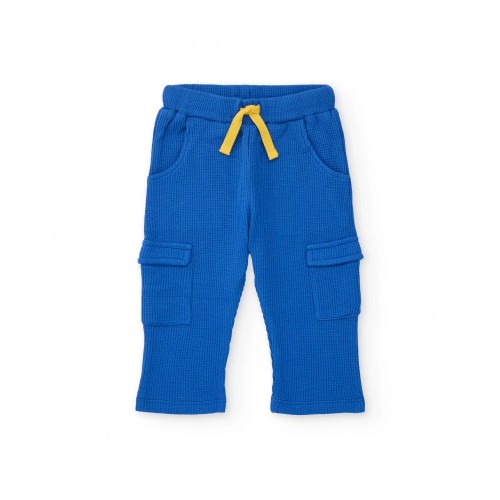 colours. The trousers, made from a textured knit fabric, stand out for their deep blue tone,
