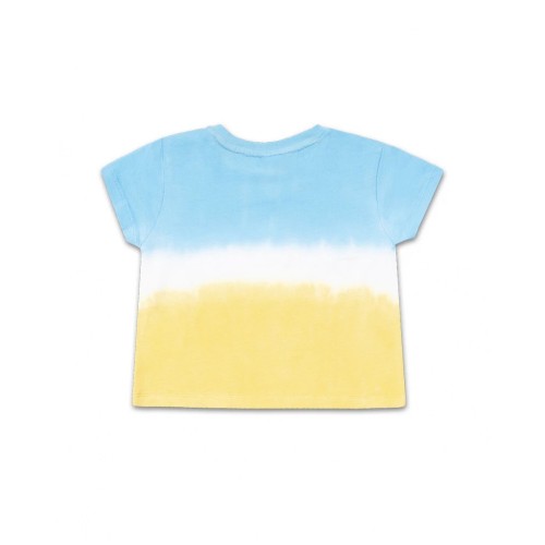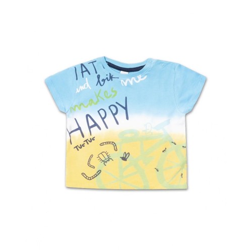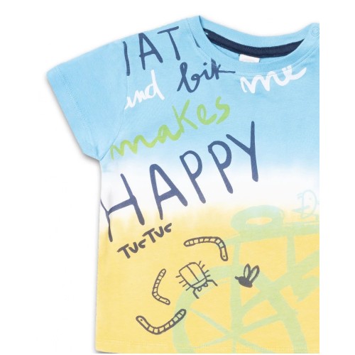 Blue and yellow tye die knit t-shirt with "Water and bikes make me happy" sign, and bike print for boy