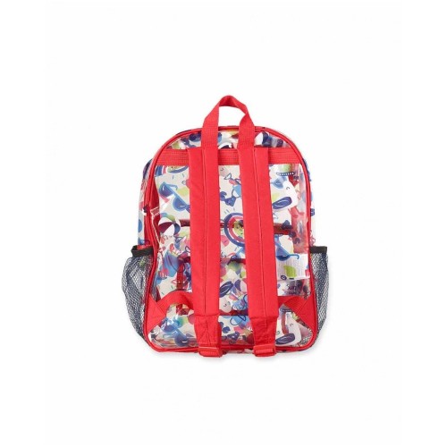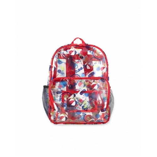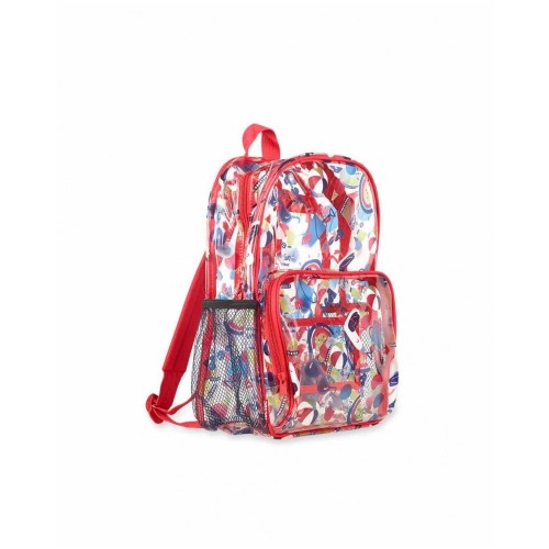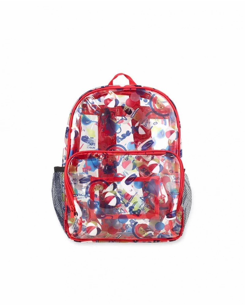 Transparent backpack with colorful summer print and red zipper and handles, unisex.