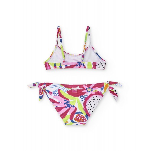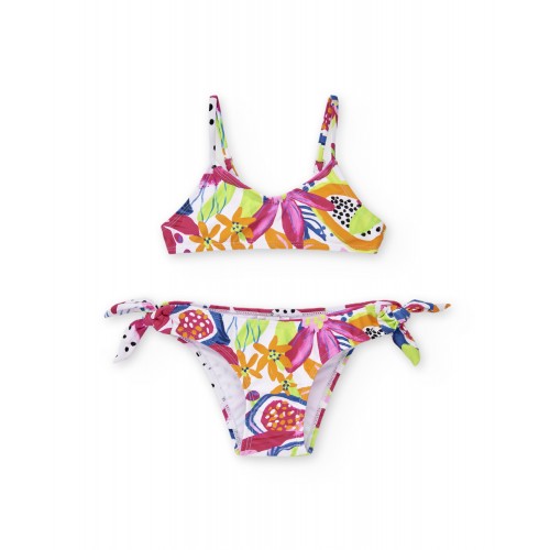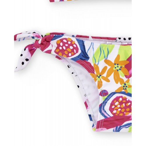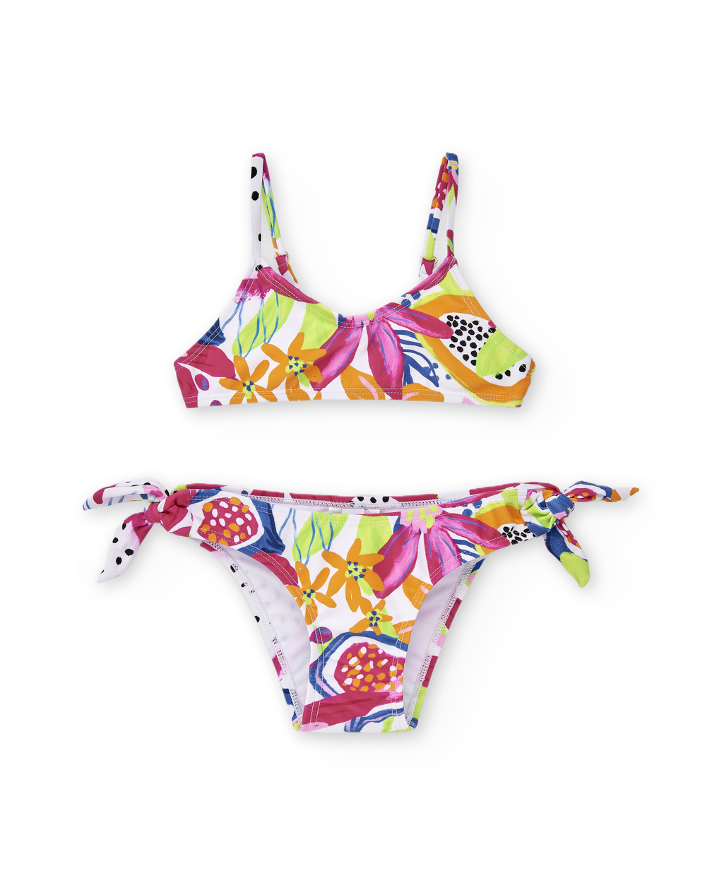 White bikini with colorful floral print and bow appliqué on the sides for girls
