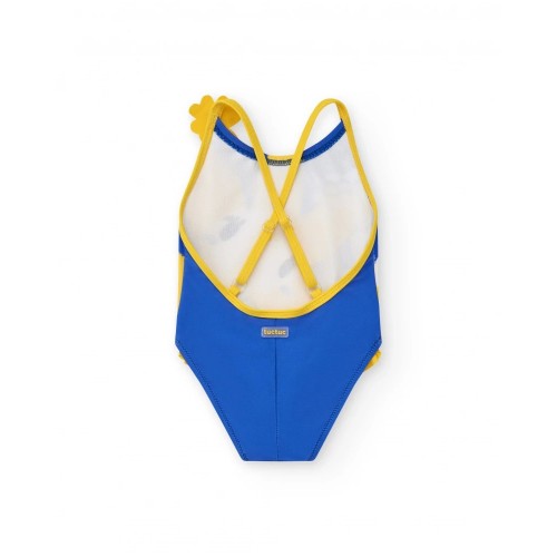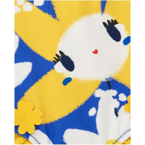 Yellow girls' swimsuit with a floral design in blue and white tones,
