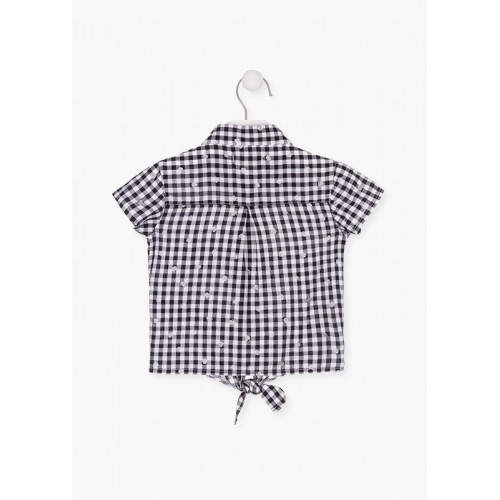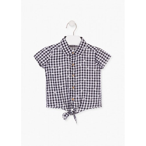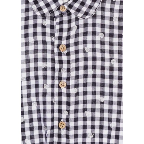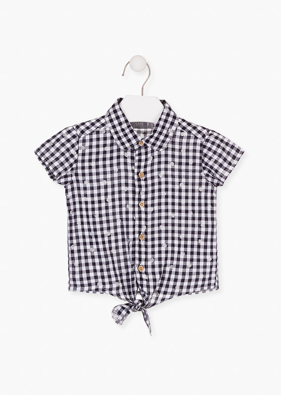 Strass μήλο πουκάμισο για κορίτσι. Μπλούζα με κοντό μανίκι. Στρίφωμα δεσίματος. Πίσω πάνελ ζυγών. Το μπροστινό άνοιγμα διαθέτει ξύλινα κουμπιά.